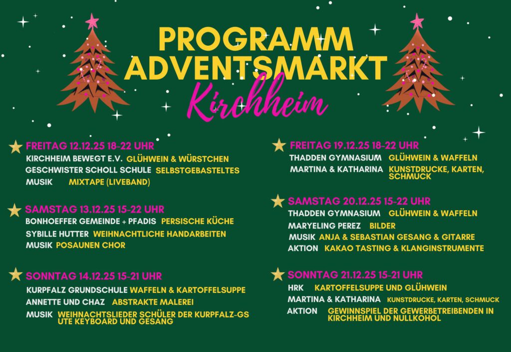 Der Verein Kirchheim bewegt und der Stadtteilverein Kirchheim planen als Ergänzung zum Weihnachtsmarkt auf dem Kerweplatz, einen kleinen, aber feinen Adventsmarkt auf dem Odenwaldplatz in Heidelberg Kirchheim durchzuführen.